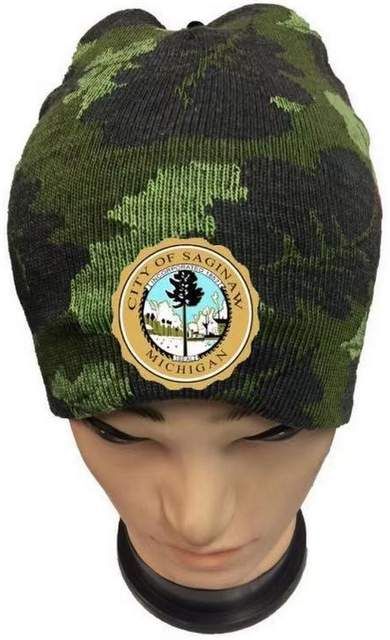A winter beanie in camo colors featuring the City of Saginaw logo or theme.