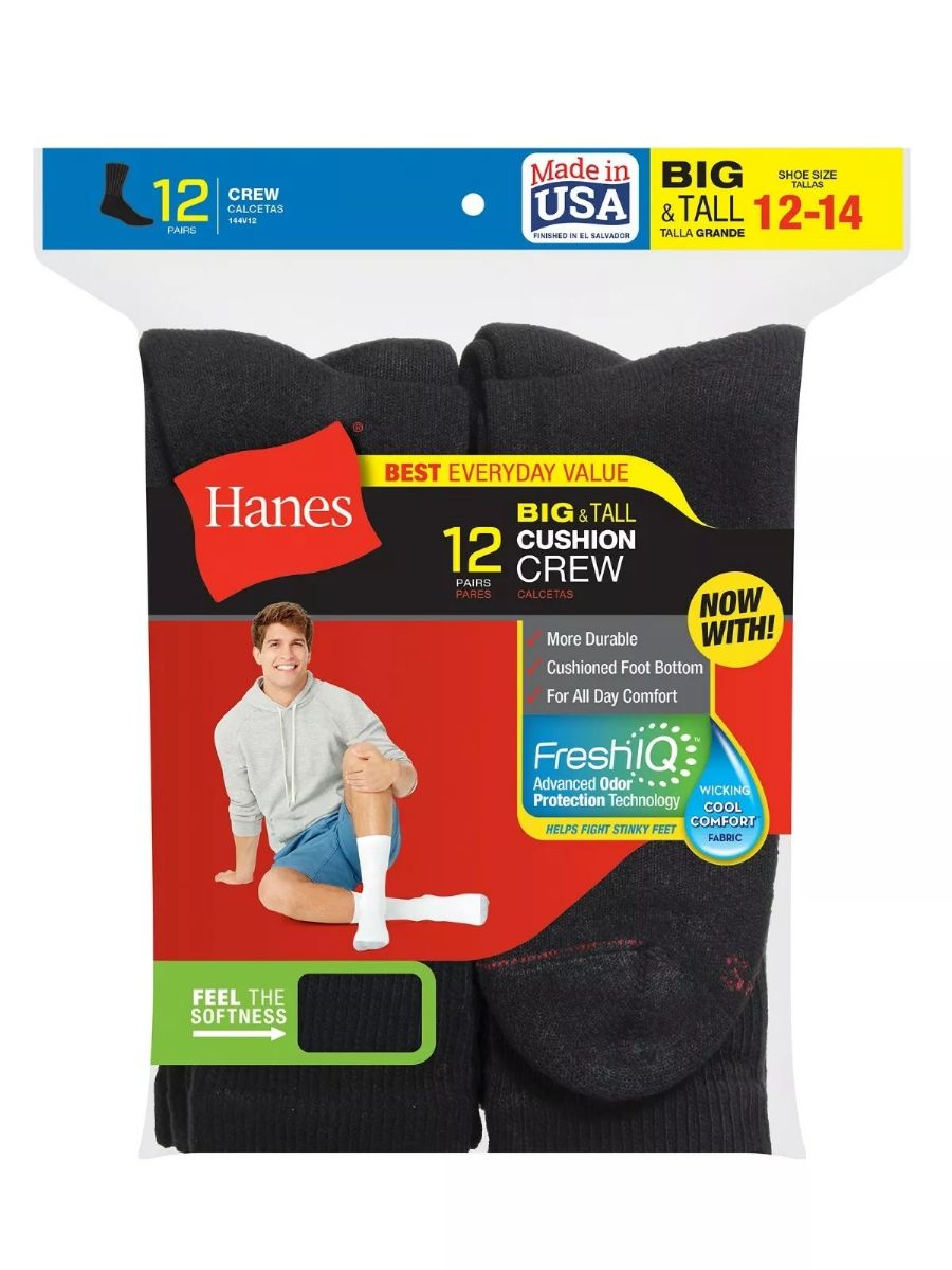 Hanes Big And Tall King Size Mens Black Crew Socks Shoe Size 12-14 at low wholesale prices. yachtandsmith.com offers Big And Tall Mens Crew Socks at bulk discounted prices.