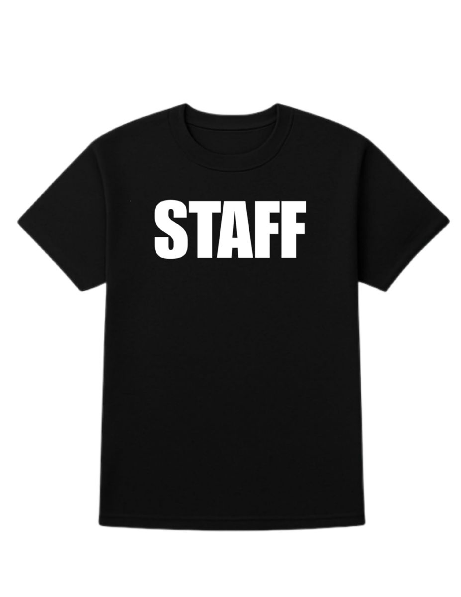 Unisex Cotton Staff Printed T Shirt Black With White Print Back And Front Size Medium at low wholesale prices. yachtandsmith.com offers Event Personnel Tees at bulk discounted prices.